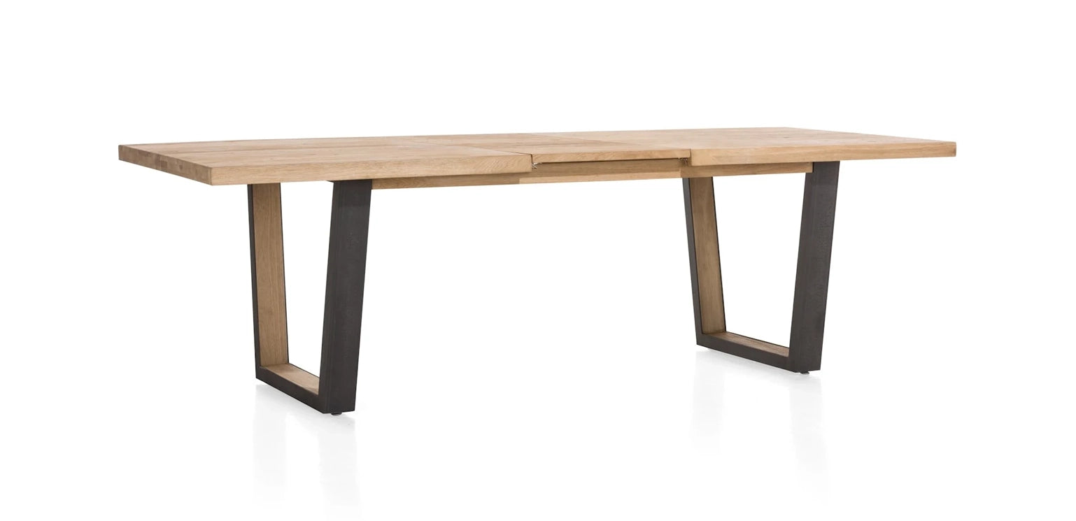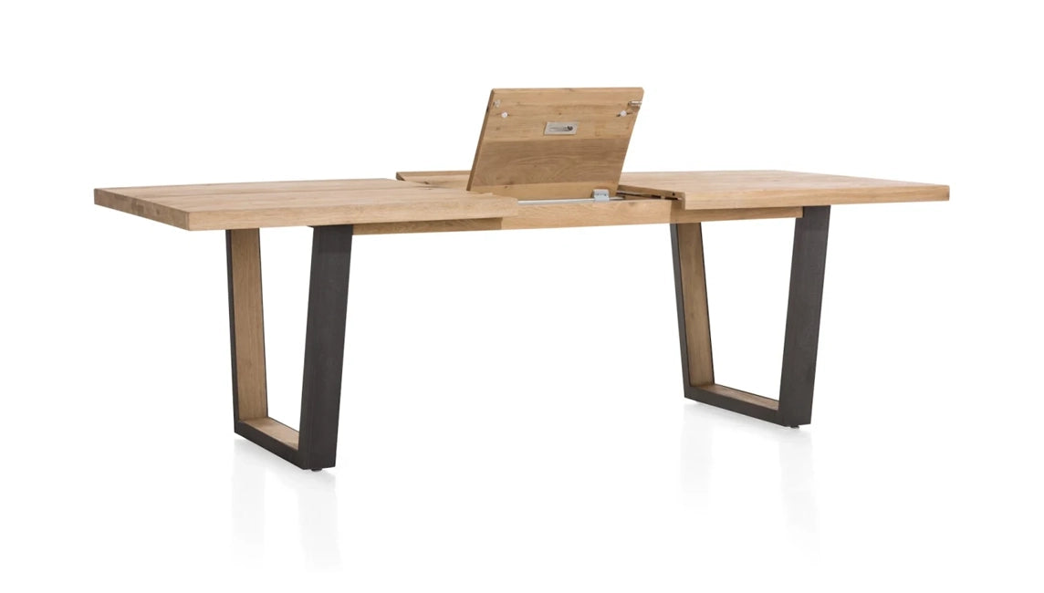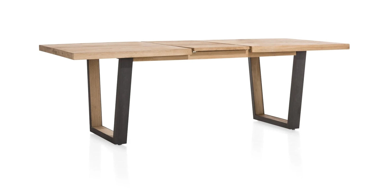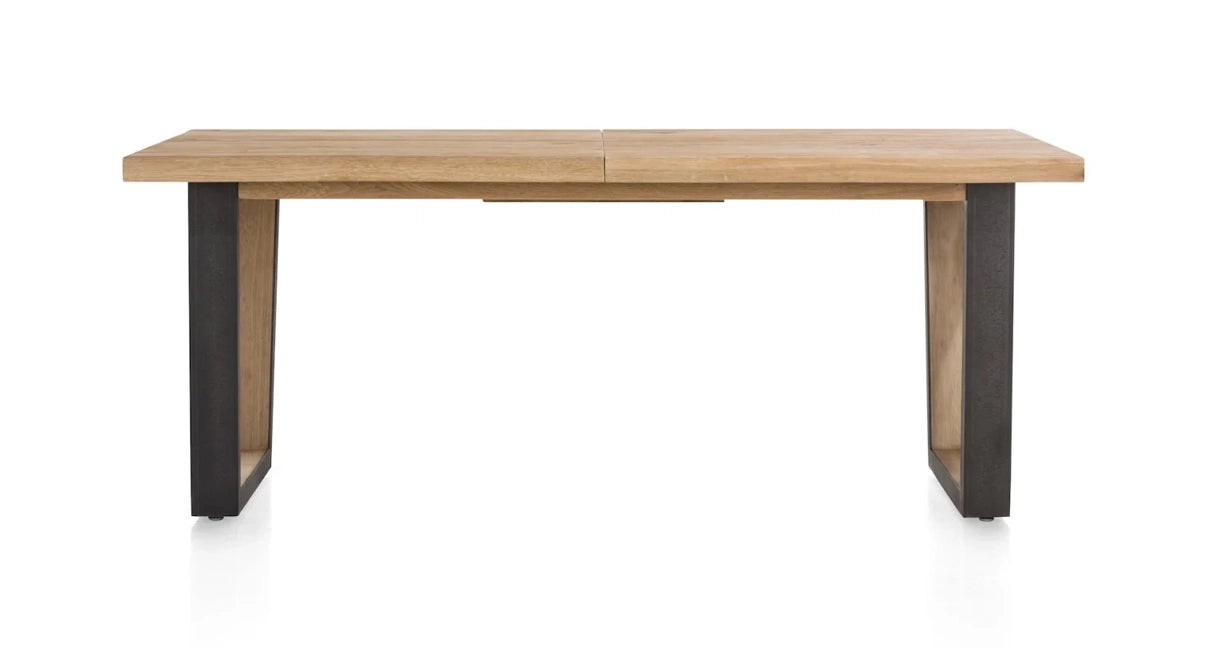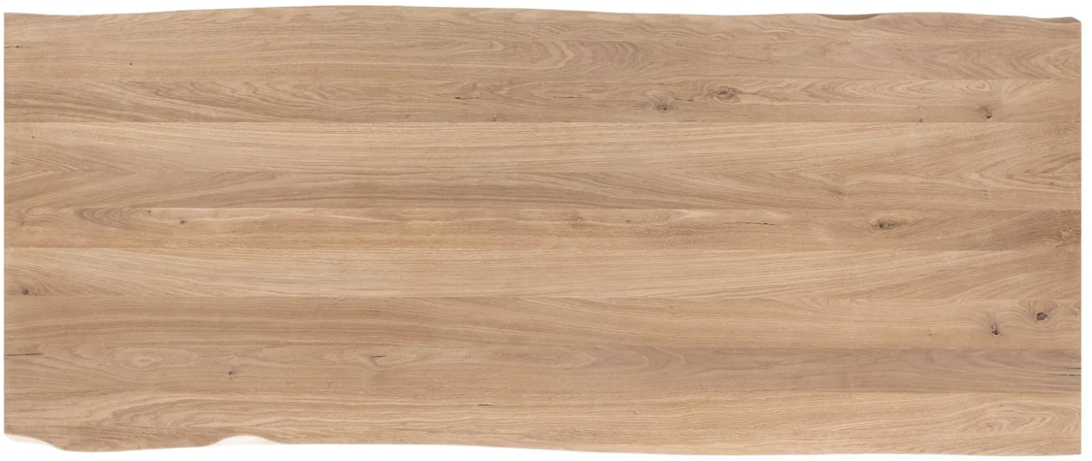 A modern extending dining table with a natural oak top and a naturally wavy edge that highlights the authentic character of the wood. The table features U-shaped metal legs with a wood insert, giving it an elegant industrial look.
