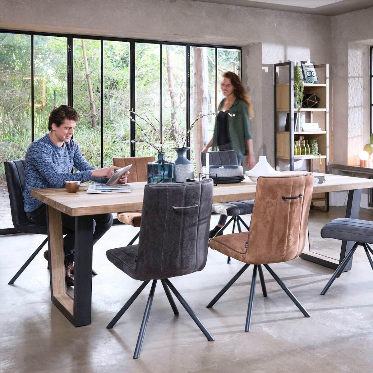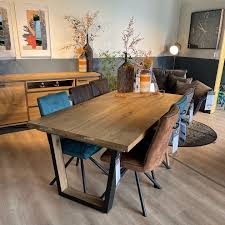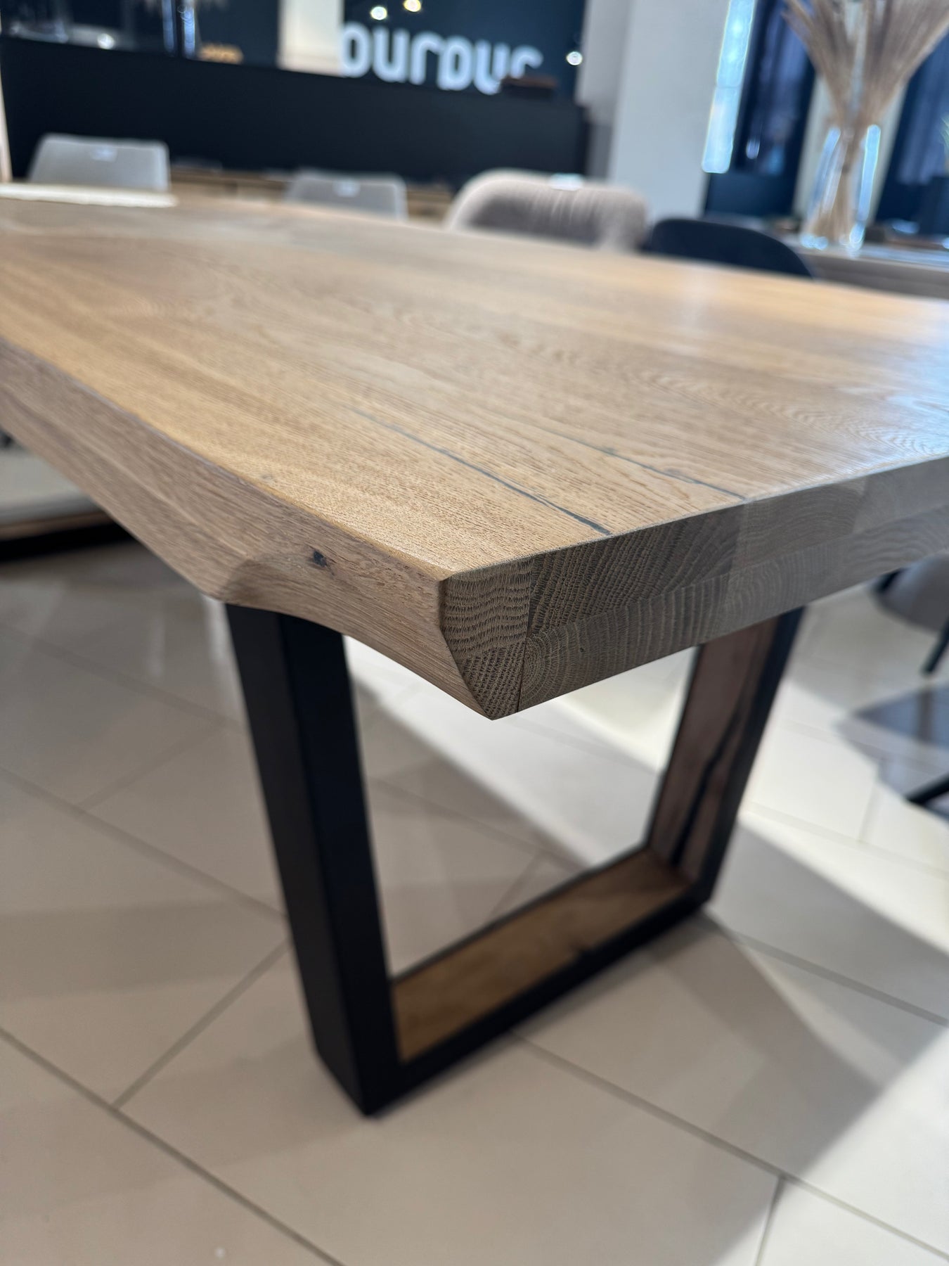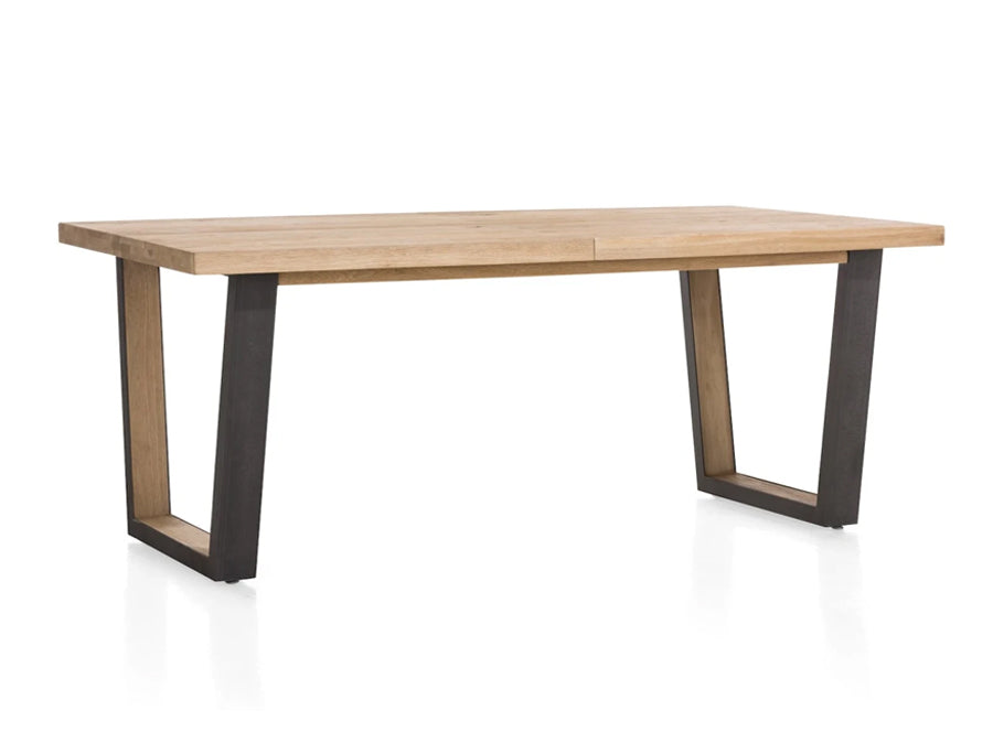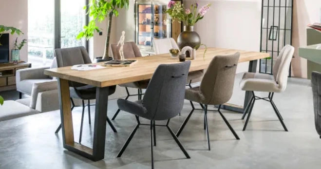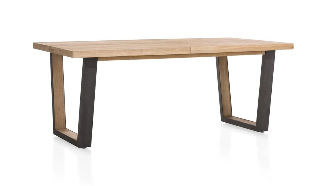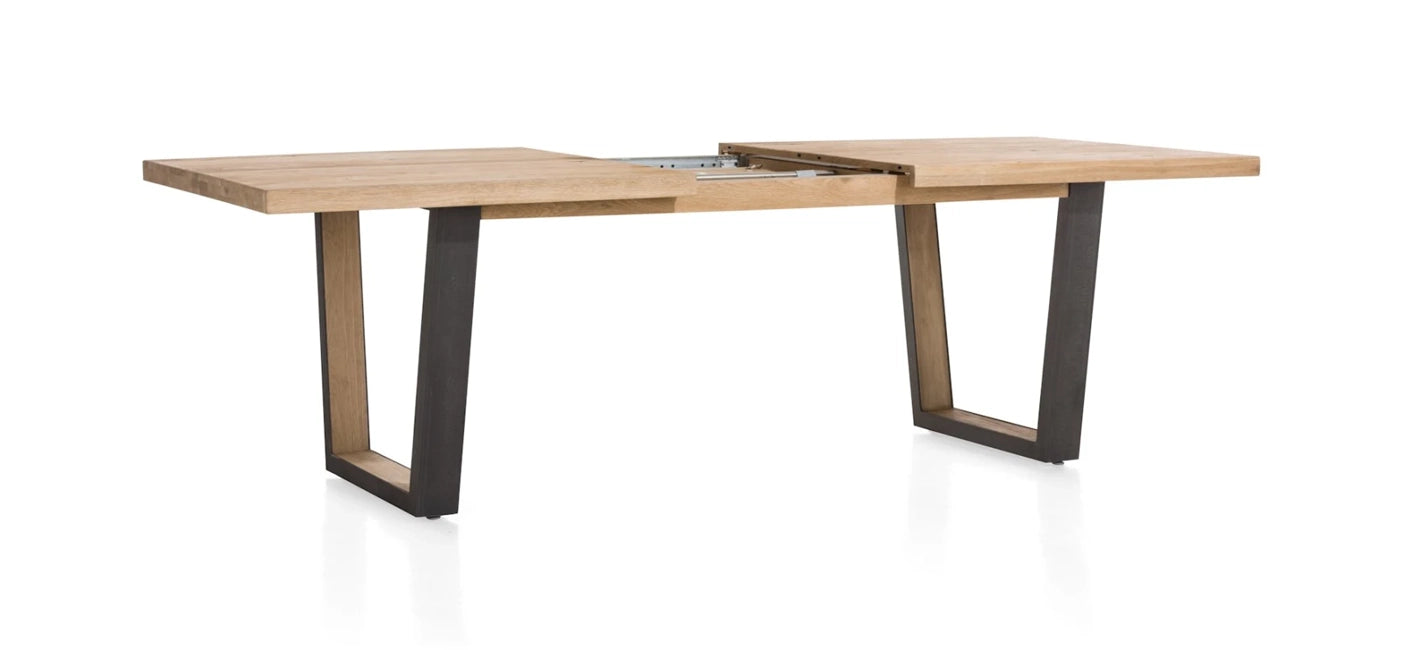 A modern extending dining table with a natural oak top and a naturally wavy edge that highlights the authentic character of the wood. The table features U-shaped metal legs with a wood insert, giving it an elegant industrial look.