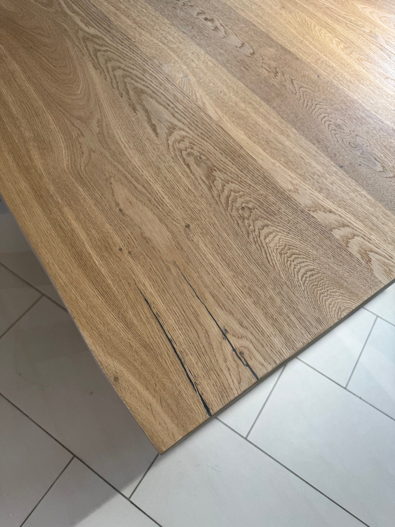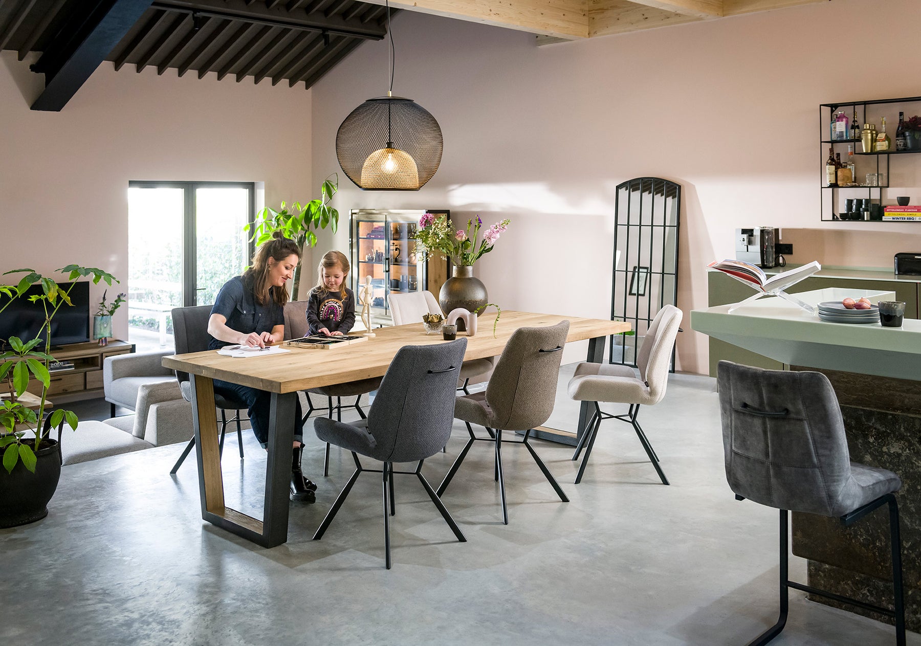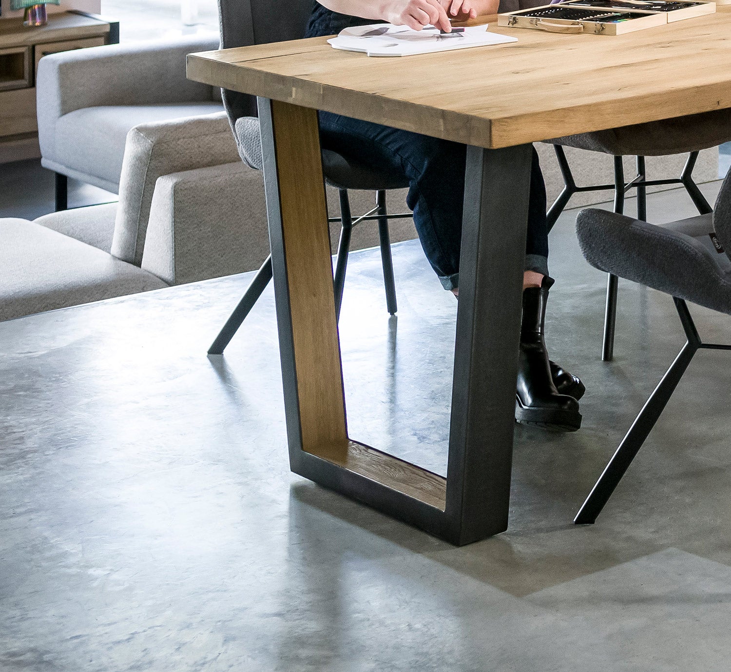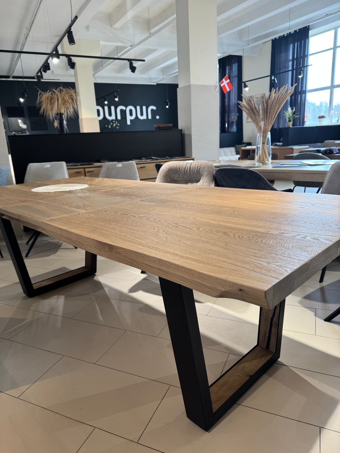 A modern extending dining table with a natural oak top and a naturally wavy edge that highlights the authentic character of the wood. The table features U-shaped metal legs with a wood insert, giving it an elegant industrial look.